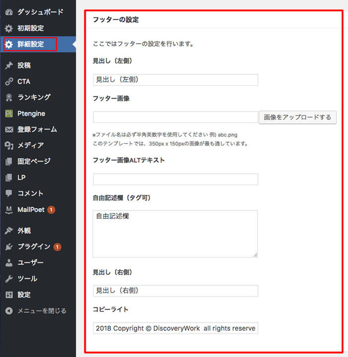 ◆サイドメニューの「詳細設定」の「フッターの設定」画面