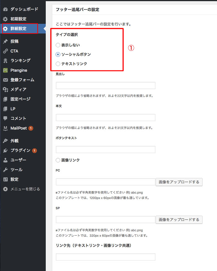 ◆サイドメニューの「詳細設定」の「フッター追尾バーの設定」画面