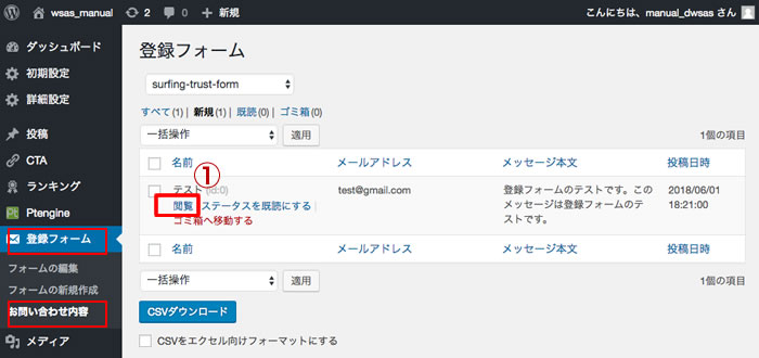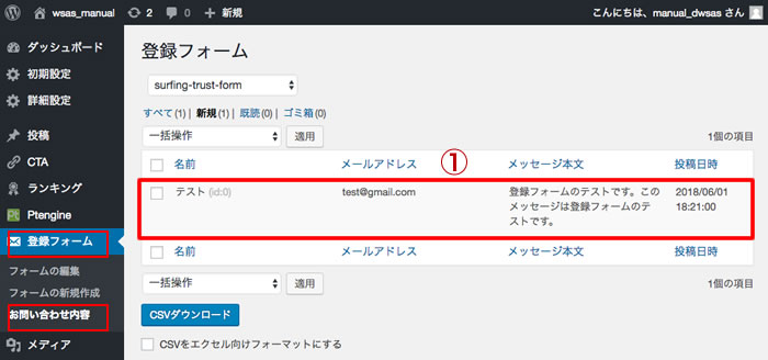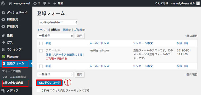 ①「CSVダウンロードする」ボタンを押すと、登録データーが一括ダウンロード可能です。
