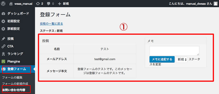 ◆「登録フォーム」の「お問い合わせ内容」の各登録者の管理画面