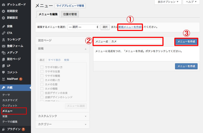③「メニューを作成」ボタンをクリック