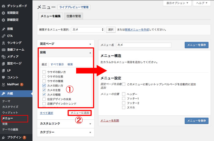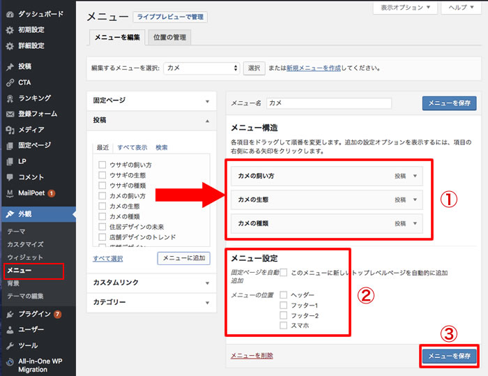 ③「メニューを保存」をクリック