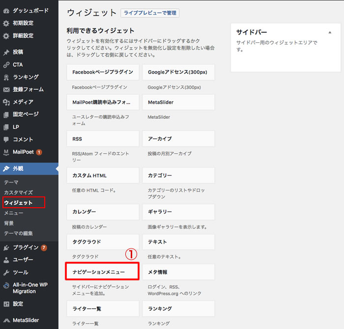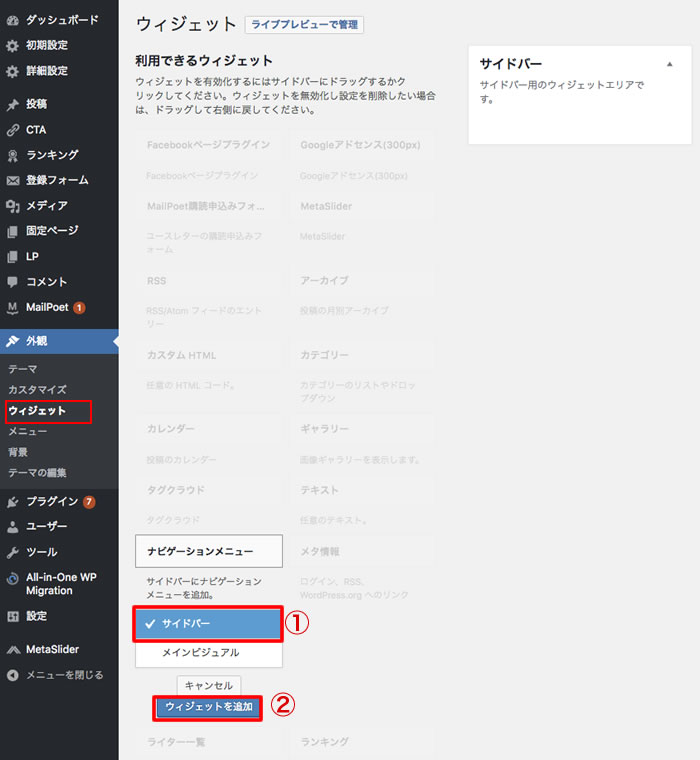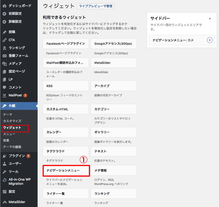 ◆サイドメニューの「外観」>「ウィジェット」を選択