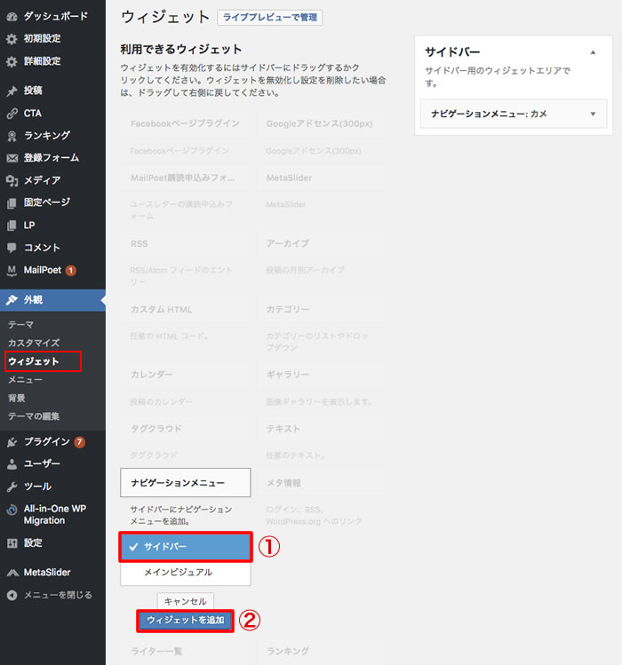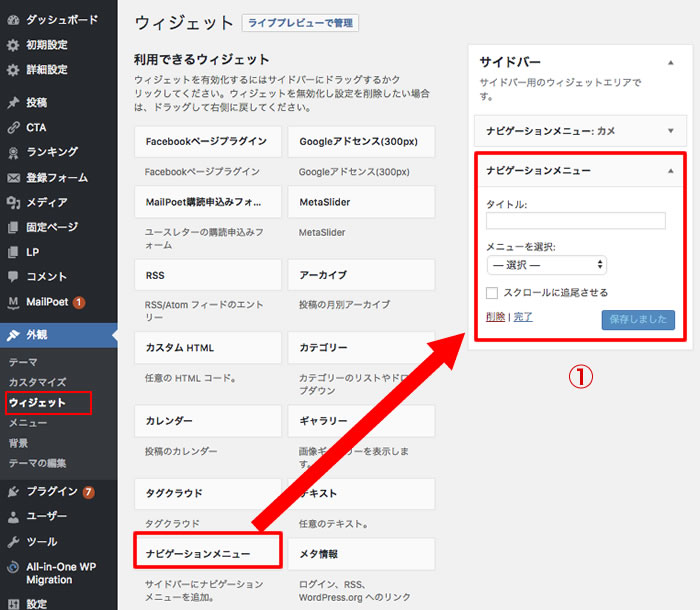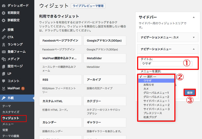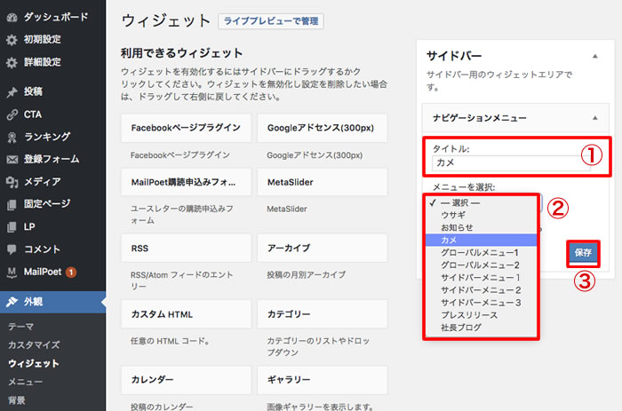 ③最後に、「ウィジェット」の「サイドバー」に、「作成したメニューを選択」する